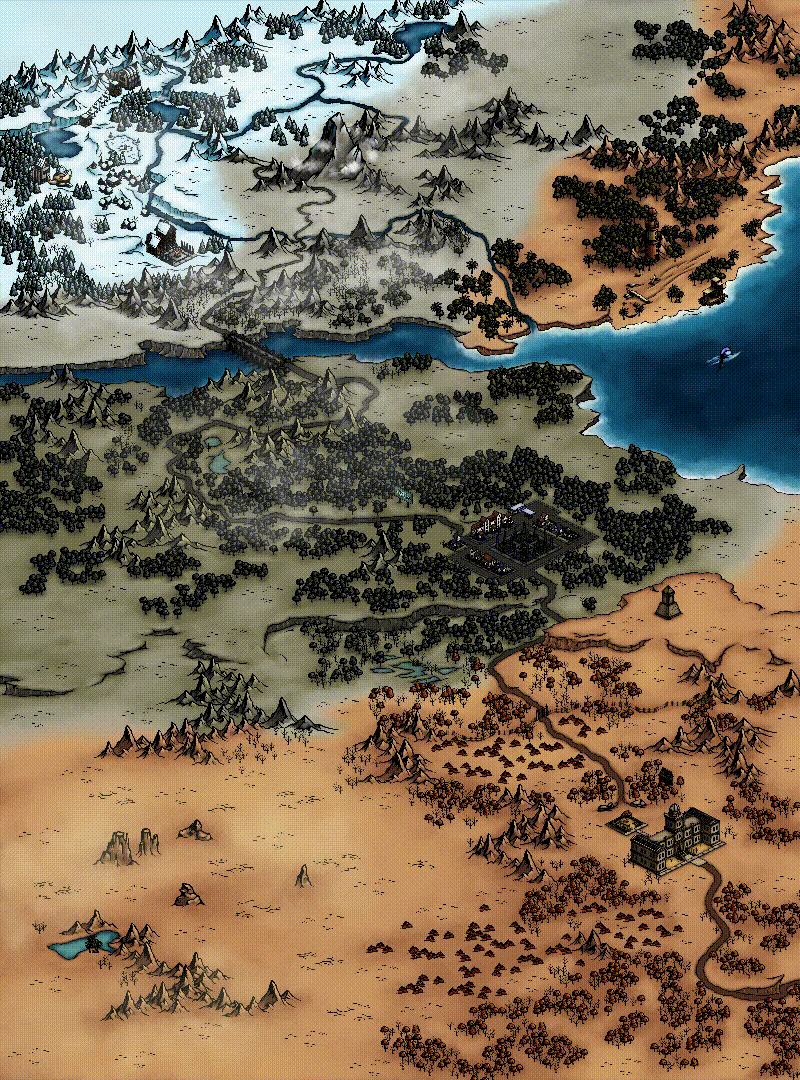 A detailed fantasy map featuring mountains in the background, forests, lakes, and winding paths with scattered buildings, some glowing warmly, suggesting a mystical or adventurous setting.