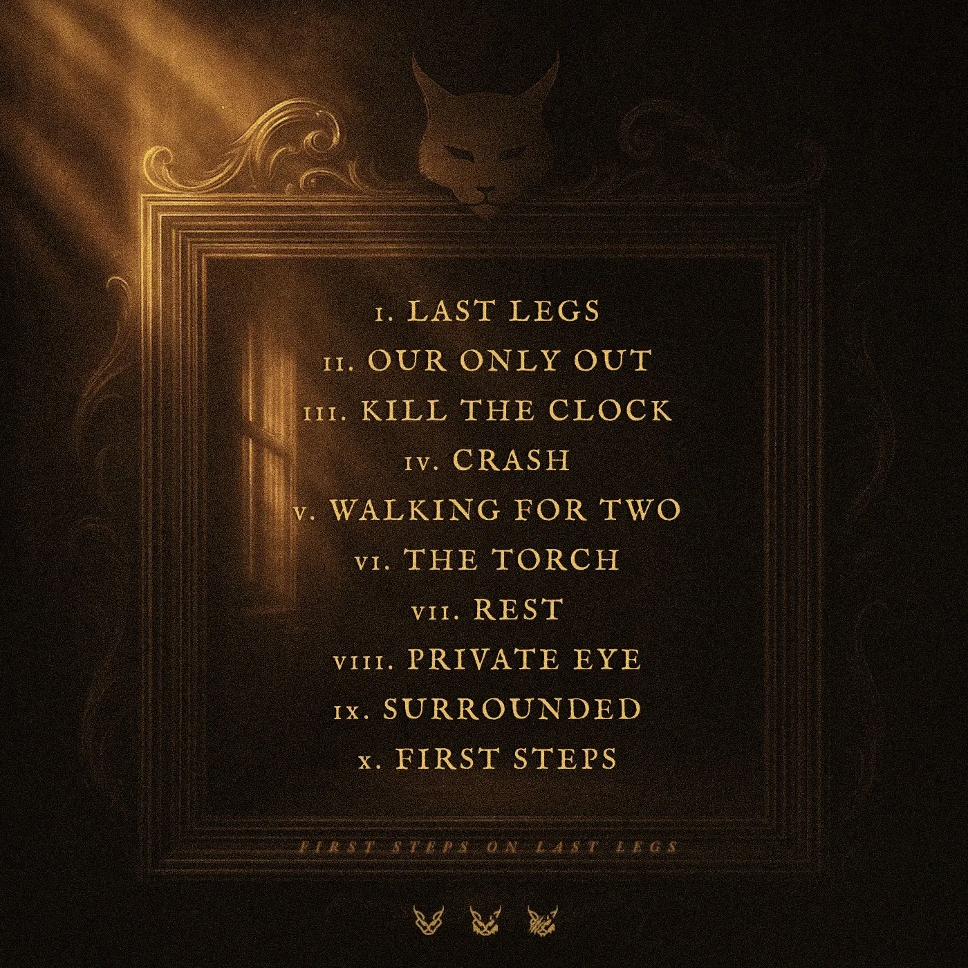 A dark, framed list of song titles with a mysterious, devilish creature's face at the top, illuminated by a faint golden light.
